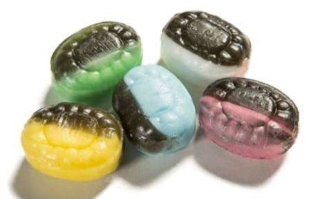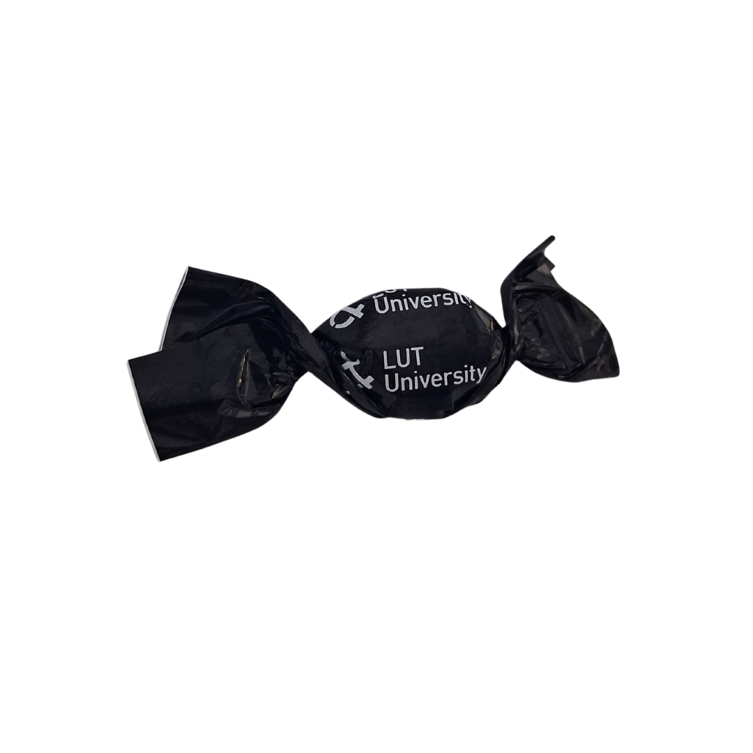 Vegan, palm oil-free and gluten-free liquorice-fruit candy with a salty liquorice powder filling. The wrapper is compostable paper.